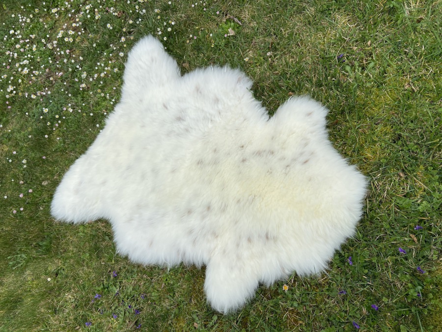 Weißes Fell mit zarten dunklen Punkten Rustikal, fest und polsternd.